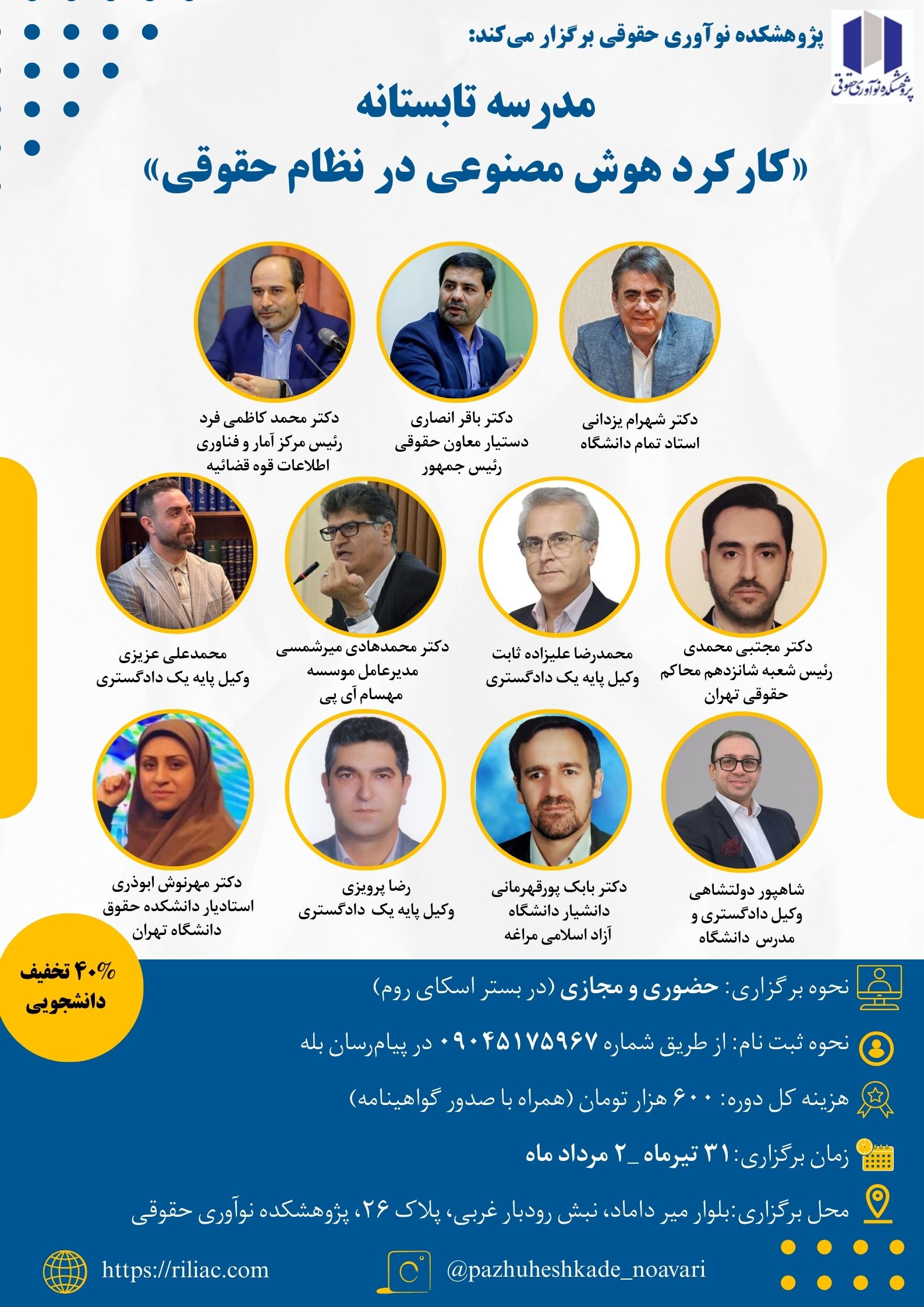 درسه تابستانه «کارکرد هوش مصنوعی در نظام حقوقی» با تدریس اساتید و پژوهشگران حوزه هوش مصنوعی در سه روز برگزار میشود.